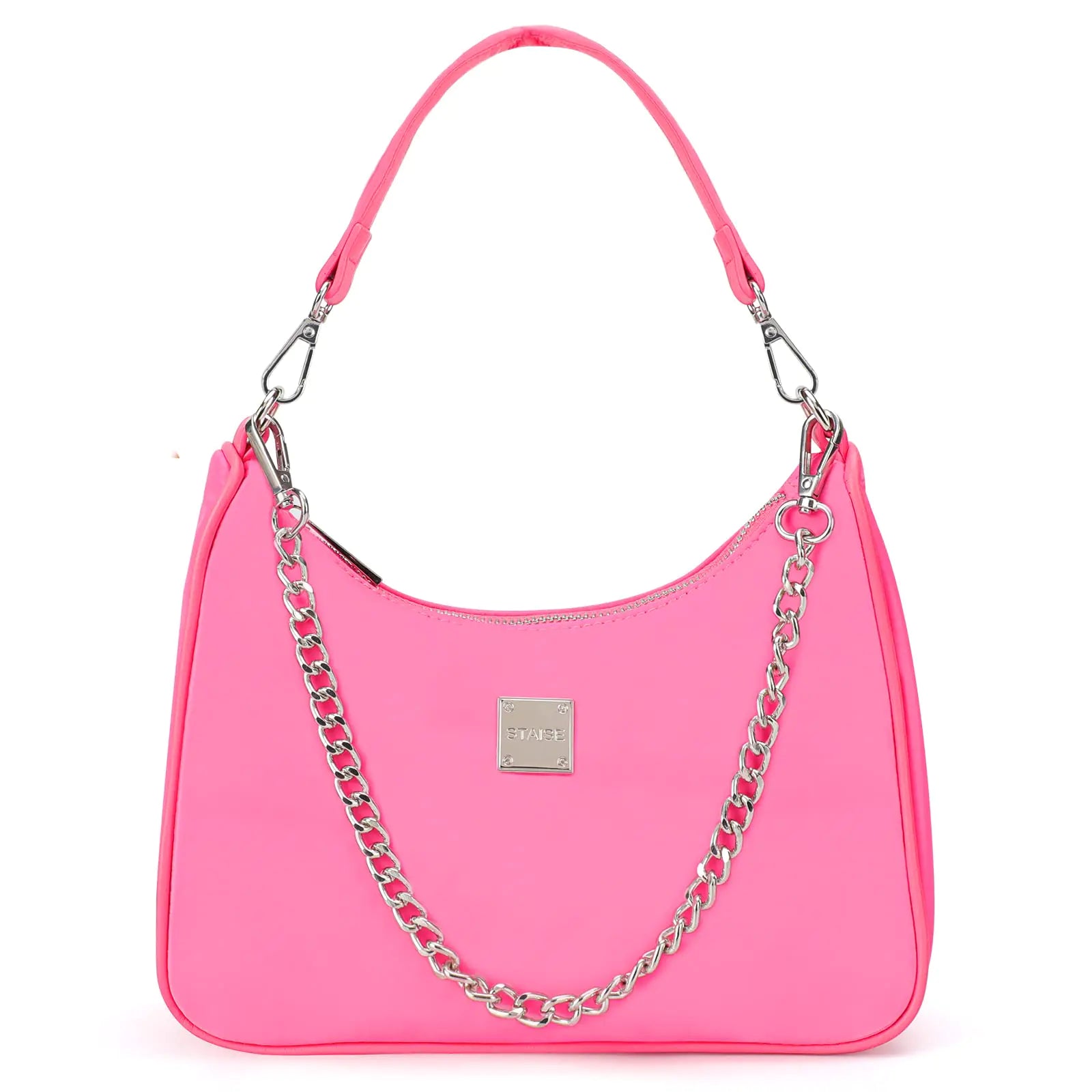 Inspired by the iconic hobo bag, the Staise shoulder bag combines classic design with sustainable innovation, crafted from Re-Nylon — a regenerated nylon yarn made from recycled ocean plastics and textile waste. This compact, feminine mini bag features distinctive Saffiano leather trim and a contemporary blend of materials. Its versatile design allows seamless switching between shoulder and crossbody styles, thanks to detachable straps and a chain. Measuring 8"W x 8"H x 3"D, it securely holds essentials like phones, keys, and cards with a zipper closure and an internal slip pocket. An ideal gift choice, backed by responsive customer service and a satisfaction guarantee.