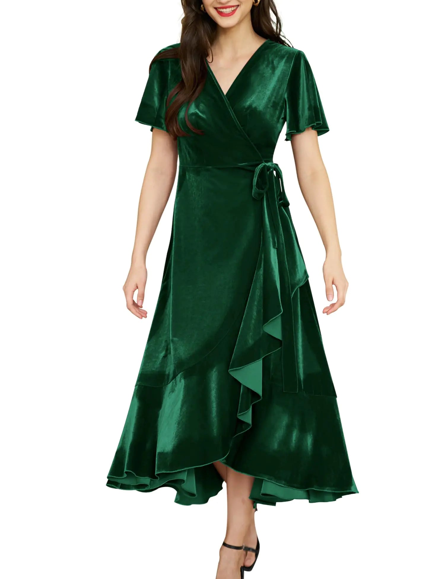 Crafted from premium velvet, this maxi dress delivers a soft feel and elegant flow for superior comfort and style. Its wrap design flatters your figure by highlighting your curves naturally. The boho-inspired V-neckline adds a sophisticated, fashionable edge. Practical side pockets enhance functionality, perfect for carrying essentials. Ideal for a variety of occasions such as weddings, parties, dinners, holiday events, and more, this dress seamlessly blends casual charm with semi-formal elegance. A versatile addition to any wardrobe, it suits events from celebrations to maternity wear with ease.